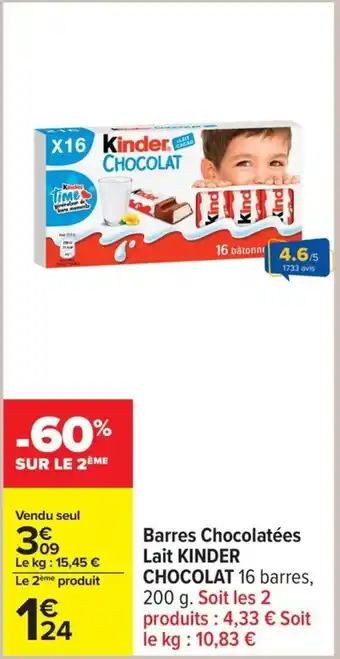 Actuellement en offre chez Carrefour : Barres chocolatées lait kinder chocolat ✅ Valable du 6-01 au 19-01.