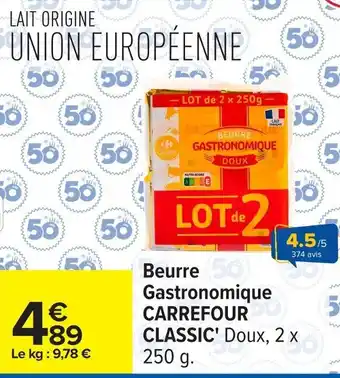 En plus de l'offre Beurre gastronomique carrefour classic, Carrefour propose une large gamme de produits. Consultez le Catalogue Carrefour hebdomadaire pour découvrir les meilleures offres et promotions. En plus de Beurre gastronomique carrefour classic, il y a aussi : Carrefour - beurre gastronomique classic', CARREFOUR CLASSIC Beurre Gastronomique & PRÉSIDENT Beurre gastronomique doux.