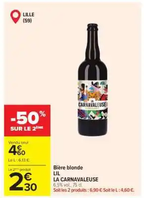 Actuellement en offre chez Carrefour : Bière blonde LIL LA CARNAVALEUSE ✅ Valable du 17-02 au 4-03.