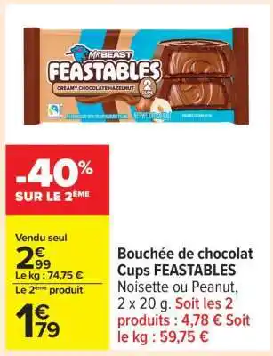 Actuellement en offre chez Carrefour : Bouchée de chocolat Cups FEASTABLES ✅ Valable du 17-03 au 30-03.