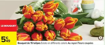 En plus de l'offre Bouquet de 15 tulipes, Carrefour propose une large gamme de produits. Consultez le Catalogue Carrefour hebdomadaire pour découvrir les meilleures offres et promotions. En plus de Bouquet de 15 tulipes, il y a aussi : Bouquet 14 tulipes pailletées, Bouquet 15 roses arlequin & Bouquet d'alliums.