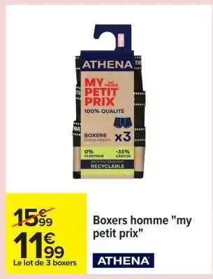 En plus de l'offre Boxers homme my petit prix, Carrefour propose une large gamme de produits. Consultez le Catalogue Carrefour hebdomadaire pour découvrir les meilleures offres et promotions. En plus de Boxers homme my petit prix, il y a aussi : Athena boxers homme my petit prix, Boxers homme & Boxers homme.
