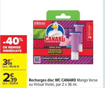 Actuellement, CANARD Recharges disc WC est en promotion chez Carrefour. Toutes les informations utiles comme le prix, les conditions et la durée de validité sont affichées sur cette page. Consultez également les promotions similaires pour CANARD Recharges disc WC, afin de faire le meilleur choix. La promo CANARD Recharges disc WC est valable du 27-01-2026 au 09-02-2026. Si elle est expirée, regardez les autres offres équivalentes. Vous pouvez aussi suivre cette catégorie de produit pour être alerté lorsqu’une nouvelle promotion CANARD Recharges disc WC apparaît chez Carrefour.Questions fréquemment posées au sujet de CANARD Recharges disc WC