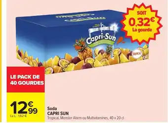 En plus de l'offre CAPRI SUN Soda, Carrefour propose une large gamme de produits. Consultez le Catalogue Carrefour hebdomadaire pour découvrir les meilleures offres et promotions. En plus de CAPRI SUN Soda, il y a aussi : Soda Capri Sun, CAPRI SUN & Capri-sun multivitamines.