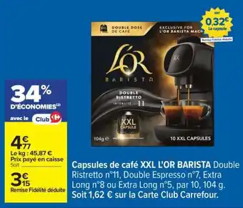Actuellement en offre chez Carrefour : Capsules de café XXL L'OR BARISTA ✅ Valable du 24-02 au 9-03.