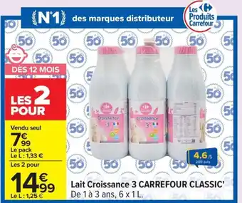 Actuellement en offre chez Carrefour : CARREFOUR CLASSIC Lait Croissance 3 ✅ Valable du 17-03 au 30-03.