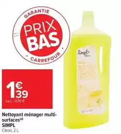 En plus de l'offre Carrefour - nettoyant ménager multi-surfaces, Carrefour propose une large gamme de produits. Consultez le Catalogue Carrefour hebdomadaire pour découvrir les meilleures offres et promotions. En plus de Carrefour - nettoyant ménager multi-surfaces, il y a aussi : Nettoyant ménager multi- surfaces simpl, Ajax nettoyant ménager multi-usages parfum muguet & Ajax - nettoyant ménager.