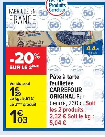 En plus de l'offre CARREFOUR ORIGINAL Pâte à tarte feuilletée, Carrefour propose une large gamme de produits. Consultez le Catalogue Carrefour hebdomadaire pour découvrir les meilleures offres et promotions. En plus de CARREFOUR ORIGINAL Pâte à tarte feuilletée, il y a aussi : Pâte à tarte feuilletée CARREFOUR ORIGINAL, CARREFOUR ORIGINAL Pâte feuilletée & HERTA Pâte à tarte feuilletée Tarte en or.