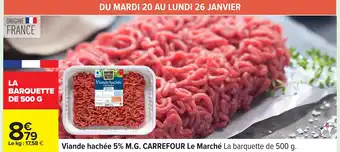 Actuellement en offre chez Carrefour : CARREFOUR Viande hachée 5% M.G. Le Marché ✅ Valable du 20-01 au 2-02.