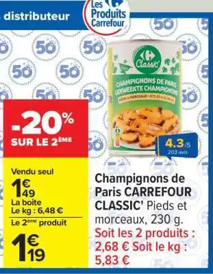 En plus de l'offre Champignons de Paris CARREFOUR CLASSIC', Carrefour propose une large gamme de produits. Consultez le Catalogue Carrefour Drive hebdomadaire pour découvrir les meilleures offres et promotions. En plus de Champignons de Paris CARREFOUR CLASSIC', il y a aussi : Carrefour - champignons de paris classic, CARREFOUR CLASSIC Champignons Paris & Jambon Le Paris CARREFOUR CLASSIC'.