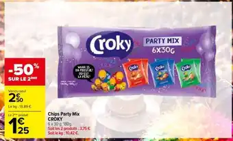 Actuellement, Chips Party Mix Croky est en promotion chez Carrefour. Toutes les informations utiles comme le prix, les conditions et la durée de validité sont affichées sur cette page. Consultez également les promotions similaires pour Chips Party Mix Croky, afin de faire le meilleur choix. La promo Chips Party Mix Croky est valable du 10-02-2026 au 16-02-2026. Si elle est expirée, regardez les autres offres équivalentes. Vous pouvez aussi suivre cette catégorie de produit pour être alerté lorsqu’une nouvelle promotion Chips Party Mix Croky apparaît chez Carrefour.Questions fréquemment posées au sujet de Chips Party Mix Croky