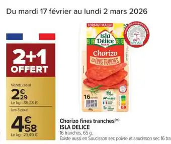 Actuellement en offre chez Carrefour : ISLA DELICE Chorizo fines tranches ✅ Valable du 17-02 au 2-03.