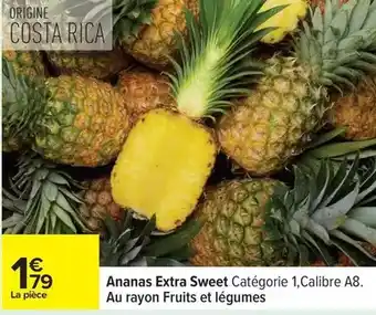 Actuellement en offre chez Carrefour : Costa - ananas extra sweet catégorie 1, calibre a8. au rayon fruits et légumes ✅ Valable du 3-03 au 16-03.