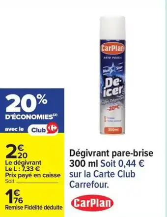 En plus de l'offre Dégivrant pare brise, Carrefour propose une large gamme de produits. Consultez le Catalogue Carrefour hebdomadaire pour découvrir les meilleures offres et promotions. En plus de Dégivrant pare brise, il y a aussi : Carplan auto pratic dégivrant pare-brise 300 ml, Dégivre pare-brise & Dégivre pare-brise.