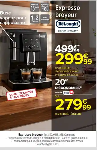 Quand DELONGHI Expresso broyeur sera-t-elle en promotion ? Ou encore : "Est-ce que DELONGHI Expresso broyeur sera en promotion la semaine prochaine ?" C’est une question fréquente. Beaucoup de consommateurs établissent leur liste de courses à l’avance. Pour cette raison, nous mettons en ligne les informations sur les promos à venir dès qu’elles sont connues. Cela vous permet de planifier vos achats et de faire de bonnes affaires. Consultez régulièrement notre site pour savoir si une nouvelle promo sur DELONGHI Expresso broyeur arrive bientôt chez Carrefour.Questions fréquemment posées au sujet de DELONGHI Expresso broyeur