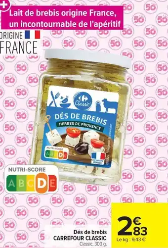 Actuellement, Dés de brebis CARREFOUR CLASSIC est en promotion chez Carrefour. Toutes les informations utiles comme le prix, les conditions et la durée de validité sont affichées sur cette page. Consultez également les promotions similaires pour Dés de brebis CARREFOUR CLASSIC, afin de faire le meilleur choix. La promo Dés de brebis CARREFOUR CLASSIC est valable du 05-05-2026 au 01-06-2026. Si elle est expirée, regardez les autres offres équivalentes. Vous pouvez aussi suivre cette catégorie de produit pour être alerté lorsqu’une nouvelle promotion Dés de brebis CARREFOUR CLASSIC apparaît chez Carrefour.Questions fréquemment posées au sujet de Dés de brebis CARREFOUR CLASSIC