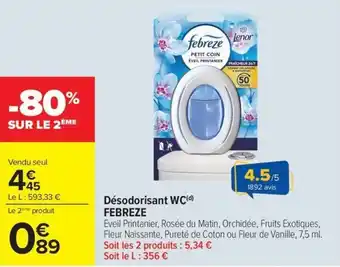 Désodorisant WC FEBREZE bénéficie actuellement d'une réduction chez Carrefour. Vous trouverez ici toutes les infos utiles sur les prix, la durée de validité et les conditions de l’offre. Pensez à consulter aussi d'autres offres et promotions similaires pour Désodorisant WC FEBREZE afin d’acheter toujours au bon prix. La promo Désodorisant WC FEBREZE est valable du 05-05-2026 au 18-05-2026. Offre terminée ? Pas de souci. D'autres offres sur ces produits sont peut-être déjà disponibles. Vous pouvez suivre cette catégorie de produits pour rester informé en cas de nouvelle promotion Désodorisant WC FEBREZE chez Carrefour. En comparant les offres, vous êtes sûr d’acheter au prix le plus bas possible.Questions fréquemment posées au sujet de Désodorisant WC FEBREZE