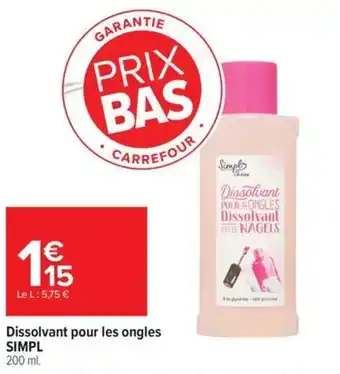 Actuellement en offre chez Carrefour : Dissolvant pour les ongles simpl ✅ Valable du 5-01 au 25-01.