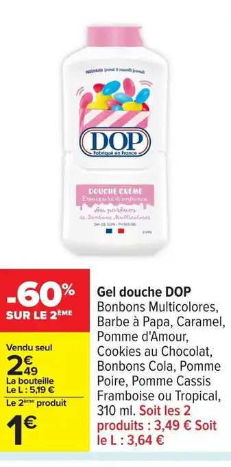 Actuellement, DOP Gel douche est en promotion chez Carrefour. Toutes les informations utiles comme le prix, les conditions et la durée de validité sont affichées sur cette page. Consultez également les promotions similaires pour DOP Gel douche, afin de faire le meilleur choix. La promo DOP Gel douche est valable du 20-01-2026 au 02-02-2026. Si elle est expirée, regardez les autres offres équivalentes. Vous pouvez aussi suivre cette catégorie de produit pour être alerté lorsqu’une nouvelle promotion DOP Gel douche apparaît chez Carrefour.Questions fréquemment posées au sujet de DOP Gel douche