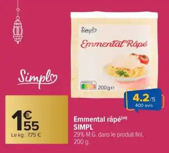 Actuellement en offre chez Carrefour : Emmental râpé SIMPL ✅ Valable du 17-02 au 2-03.