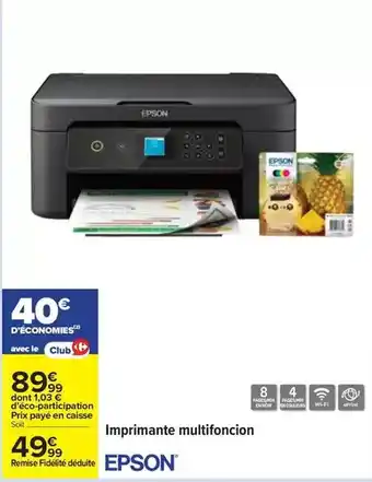 Le prix de l'offre Epson - imprimante multifoncion se trouve également en haut de la page, ainsi que la date à laquelle l'offre est disponible. Vous pouvez également vérifier les prix dans le Catalogue Carrefour actuel ou sur le site Internet de Carrefour. Les offres vous permettent d'acheter les produits Carrefour au prix le plus bas.