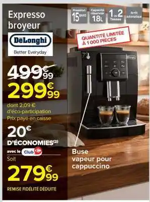 Le prix de l'offre Expresso Broyeur DeLonghi se trouve également en haut de la page, ainsi que la date à laquelle l'offre est disponible. Vous pouvez également vérifier les prix dans le Catalogue Carrefour actuel ou sur le site Internet de Carrefour. Les offres vous permettent d'acheter les produits Carrefour au prix le plus bas.