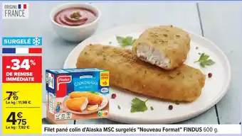 Actuellement en offre chez Carrefour : FINDUS Filet pané colin d'Alaska MSC surgelés Nouveau Format ✅ Valable du 21-01 au 16-02.