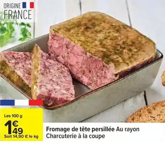 En plus de l'offre Fromage de tête persillée, Carrefour propose une large gamme de produits. Consultez le Catalogue Carrefour hebdomadaire pour découvrir les meilleures offres et promotions. En plus de Fromage de tête persillée, il y a aussi : Carrefour fromage de tête persillée, 6 cailles sans tête & Le gaulois 6 cailles sans tête.
