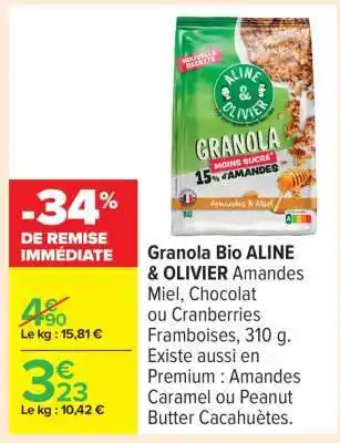 Actuellement en offre chez Carrefour : Granola Bio ALINE & OLIVIER ✅ Valable du 3-03 au 16-03.
