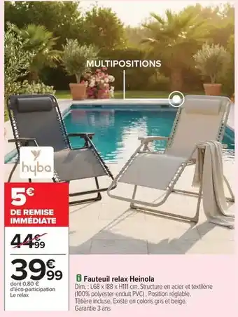 Actuellement en offre chez Carrefour : Hyba - fauteuil relax heinola ✅ Valable du 14-04 au 27-04.