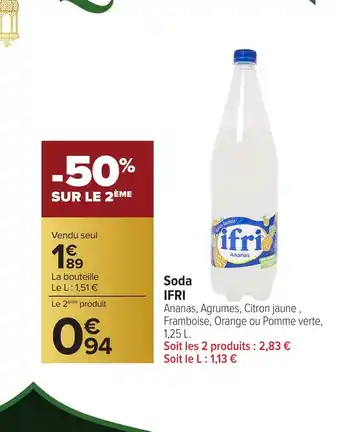 Actuellement, IFRI Soda est en promotion chez Carrefour. Toutes les informations utiles comme le prix, les conditions et la durée de validité sont affichées sur cette page. Consultez également les promotions similaires pour IFRI Soda, afin de faire le meilleur choix. La promo IFRI Soda est valable du 03-02-2026 au 16-02-2026. Si elle est expirée, regardez les autres offres équivalentes. Vous pouvez aussi suivre cette catégorie de produit pour être alerté lorsqu’une nouvelle promotion IFRI Soda apparaît chez Carrefour.Questions fréquemment posées au sujet de IFRI Soda