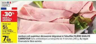 Jambon cuit supérieur découenné dégraissé à l'étouffée FILIÈRE QUALITÉ CARREFOUR offres et promotions en ligne chez Carrefour
