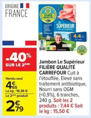 En plus de l'offre Jambon Le Supérieur FILIÈRE QUALITÉ CARREFOUR, Carrefour propose une large gamme de produits. Consultez le Catalogue Carrefour hebdomadaire pour découvrir les meilleures offres et promotions. En plus de Jambon Le Supérieur FILIÈRE QUALITÉ CARREFOUR, il y a aussi : FILIÈRE QUALITÉ CARREFOUR Jambon Le Supérieur, Jambon cuit supérieur avec couenne filiere qualite carrefour & Jambon cuit supérieur avec couenne FILIÈRE QUALITÉ CARREFOUR.