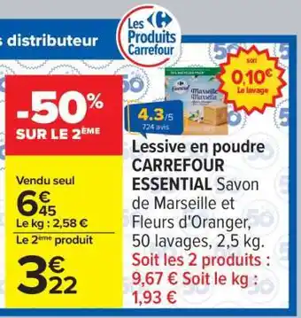 En plus de l'offre Lessive en poudre CARREFOUR ESSENTIAL, Carrefour propose une large gamme de produits. Consultez le Catalogue Carrefour hebdomadaire pour découvrir les meilleures offres et promotions. En plus de Lessive en poudre CARREFOUR ESSENTIAL, il y a aussi : Carrefour essential lessive en poudre, Carrefour - lessive en poudre & Lessive liquide CARREFOUR ESSENTIAL.