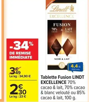En plus de l'offre LINDT EXCELLENCE Tablett Fusion, Carrefour propose une large gamme de produits. Consultez le Catalogue Carrefour hebdomadaire pour découvrir les meilleures offres et promotions. En plus de LINDT EXCELLENCE Tablett Fusion, il y a aussi : Tablette de Chocolat Fusion LINDT EXCELLENCE, LINDT EXCELLENCE Tablette de chocolat fusion & Lindt chocolat excellence fusion noir 70% et lait.