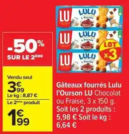 L'offre est disponible dans plusieurs magasins, vérifiez tous les produits pour obtenir le Lu - gâteaux fourrés lu le moins cher. Si vous souhaitez savoir si l'article est en vente avec une plus grosse remise dans un autre magasin, consultez la catégorie 'Supermarché'. Ces offres pourraient aussi vous intéresser : LU Gâteaux fourrés Lulu l'Ourson, Lu gâteaux fourrés lulu l'ourson lot de 3 & Lu - gâteaux fourrés l'ourson.