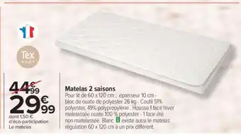 En plus de l'offre Matelas 2 saisons, Carrefour propose une large gamme de produits. Consultez le Catalogue Carrefour hebdomadaire pour découvrir les meilleures offres et promotions. En plus de Matelas 2 saisons, il y a aussi : Tex - matelas 2 saisons, Potage des 4 saisons & Couette 4 saisons.