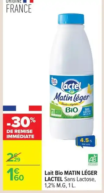 Offre MATIN LÉGER LACTEL Lait Bio chez Carrefour