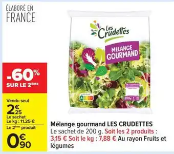 Le prix de l'offre Mélange Gourmand Les Crudettes se trouve également en haut de la page, ainsi que la date à laquelle l'offre est disponible. Vous pouvez également vérifier les prix dans le Catalogue Carrefour actuel ou sur le site Internet de Carrefour. Les offres vous permettent d'acheter les produits Carrefour au prix le plus bas.