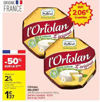 En plus de l'offre MILLERET L'Ortolan, Carrefour propose une large gamme de produits. Consultez le Catalogue Carrefour hebdomadaire pour découvrir les meilleures offres et promotions. En plus de MILLERET L'Ortolan, il y a aussi : L'ORTOLAN Mini portions fromagerie milleret, L'ortolan & Fromagerie milleret ortolan portions.