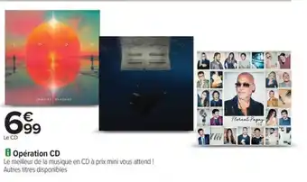 En plus de l'offre Opération CD, Carrefour propose une large gamme de produits. Consultez le Catalogue Carrefour hebdomadaire pour découvrir les meilleures offres et promotions. En plus de Opération CD, il y a aussi : Opération Vinyles, Opération Multibuy DVD & Opération Petits Prix Accessoires Auto.