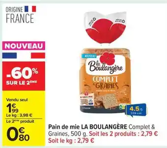 Pain de mie LA BOULANGÈRE Complet & Graines, 500 g : offres et promos Carrefour à découvrir
