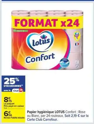 Actuellement en offre chez Carrefour : PAPIER HYGIÉNIQUE 'LOTUS CONFORT' ✅ Valable du 6-01 au 19-01.