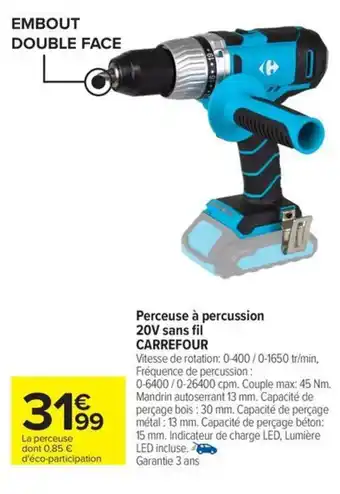 Actuellement en offre chez Carrefour : Perceuse à percussion 20v sans fil carrefour ✅ Valable du 27-01 au 16-02.