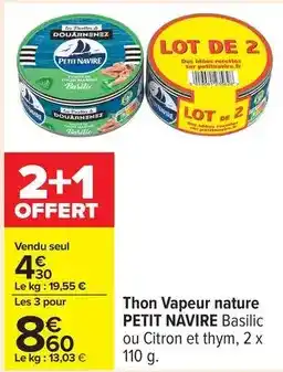 Actuellement en offre chez Carrefour : Petit navire - thon vapeur nature ✅ Valable du 10-02 au 23-02.