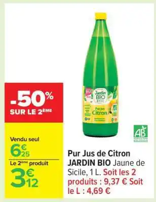 Actuellement en offre chez Carrefour : Pur Jus de Citron JARDIN BIO Jaune de Sicile, 1 L ✅ Valable du 27-01 au 9-02.