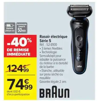 En plus de l'offre Rasoir électrique Série 5, Carrefour propose une large gamme de produits. Consultez le Catalogue Carrefour hebdomadaire pour découvrir les meilleures offres et promotions. En plus de Rasoir électrique Série 5, il y a aussi : Braun rasoir électrique série 5, Rasoir électrique Series 5000 & Philips rasoir électrique séries 5000.