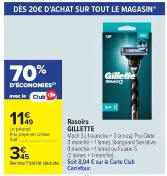 Le prix de l'offre Rasoirs GILLETTE se trouve également en haut de la page, ainsi que la date à laquelle l'offre est disponible. Vous pouvez également vérifier les prix dans le Catalogue Carrefour actuel ou sur le site Internet de Carrefour. Les offres vous permettent d'acheter les produits Carrefour au prix le plus bas.