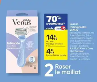 Le prix de l'offre Rasoirs rechargeables VENUS se trouve également en haut de la page, ainsi que la date à laquelle l'offre est disponible. Vous pouvez également vérifier les prix dans le Catalogue Carrefour actuel ou sur le site Internet de Carrefour. Les offres vous permettent d'acheter les produits Carrefour au prix le plus bas.