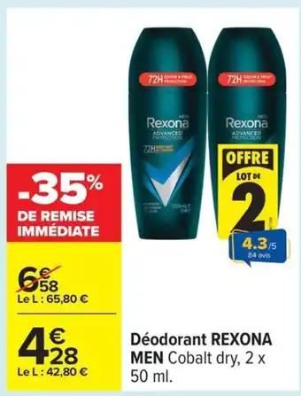 En plus de l'offre REXONA MEN Déodorant, Carrefour propose une large gamme de produits. Consultez le Catalogue Carrefour hebdomadaire pour découvrir les meilleures offres et promotions. En plus de REXONA MEN Déodorant, il y a aussi : Déodorant REXONA MEN Cobalt dry, 2 x 50 ml, Déodorant Atomiseur Femme REXONA & REXONA Déodorant Atomiseur Femme.
